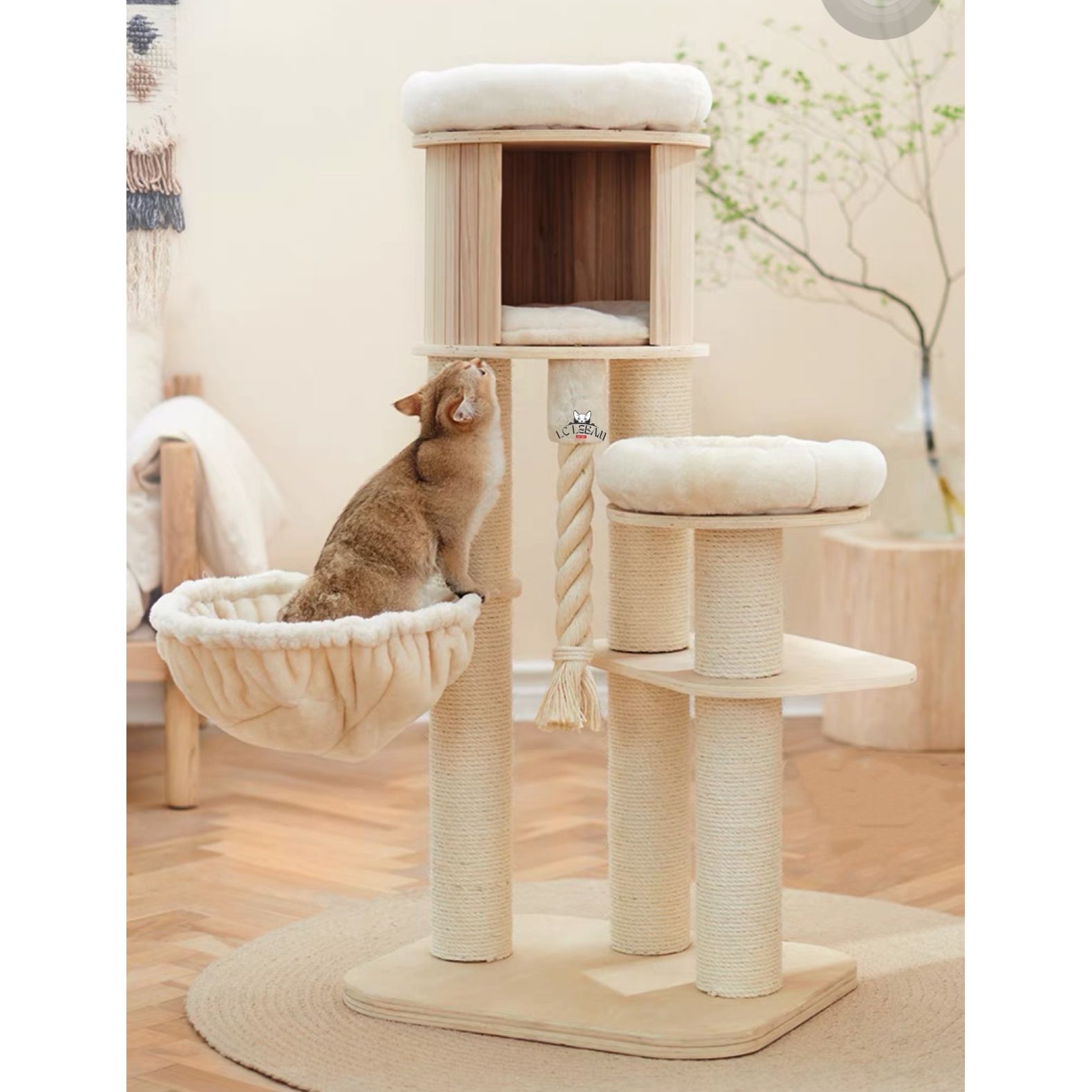 ➵ 夢幻樂園實木貓爬架𓃠 ➵ 天然進口桐木 木紋細膩 ➵ 直徑11CM劍麻柱 九芯劍麻 ➵ 仿兔絨毛 親膚材質 ➵可拆洗窩墊 環抱式貓窩 ❥ 尺寸: 48x60x113CM